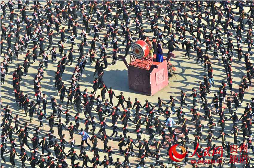 Nearly 10,000 Buyi people (an ethnic group living in south China) in national costumes danced together in Ceheng county, southwest China’s Guizhou province on Nov. 29, 2014. A certifier from the Guinness World Record granted the certificate “Buyi bamboo drum dance and Zhuanchang dance Guinness world record” to this dance after the performance. (Photo source: gz.people.cn)