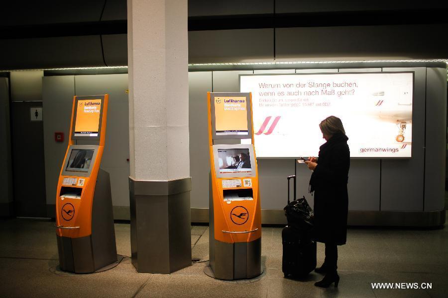 A passenger stands near Lufthansa's automatic machines in Tegel airport, Berlin, Germany, on Dec. 1, 2014. German airline Lufthansa said on Monday that it had canceled nearly half of its scheduled flights on Monday and Tuesday due to a strike by its pilots. (Xinhua/Zhang Fan) |