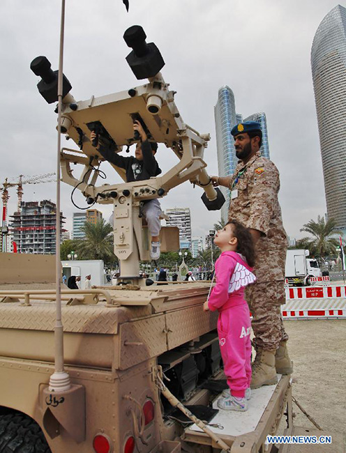 A boy operates a military equipment during a defence show to celebrate the 43rd anniversary of the founding of the United Arab Emirates (UAE) in Abu Dhabi, capital of the UAE, on Dec. 1, 2014. The UAE greets its national foundation day on Dec. 2 annualy. (Xinhua/An Jiang) |
