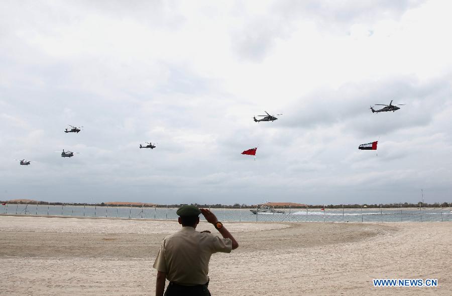 A service man solutes while military helicopters fly in formation to celebrate the 43rd anniversary of the founding of the United Arab Emirates (UAE) in Abu Dhabi, capital of the UAE, on Dec. 1, 2014. The UAE greets its national foundation day on Dec. 2 annualy. (Xinhua/An Jiang) |