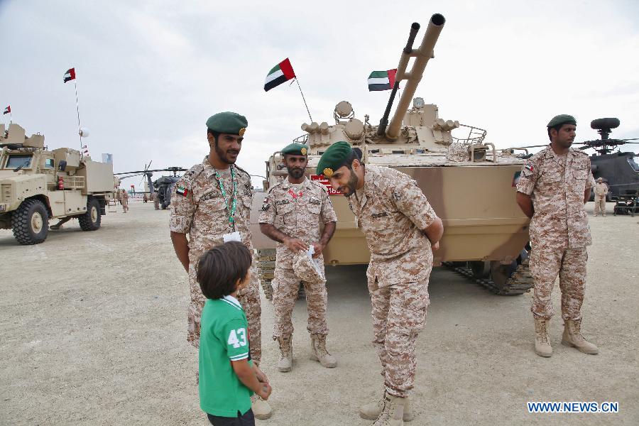 A service man talks with a child during a military show to celebrate the 43rd anniversary of the founding of the United Arab Emirates (UAE) in Abu Dhabi, capital of the UAE, on Dec. 1, 2014. The UAE greets its national foundation day on Dec. 2 annualy. (Xinhua/An Jiang) |