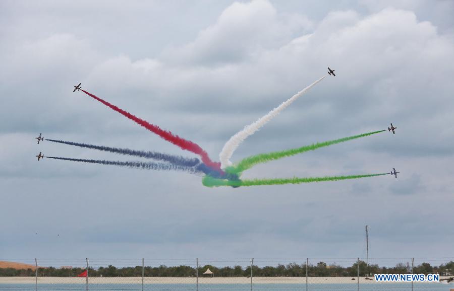 The UAE Aerobatic Display Team "Knights" perform during a military show to celebrate the 43rd anniversary of the founding of the United Arab Emirates (UAE) in Abu Dhabi, capital of the UAE, on Dec. 1, 2014. The UAE greets its national foundation day on Dec. 2 annualy. (Xinhua/An Jiang) |