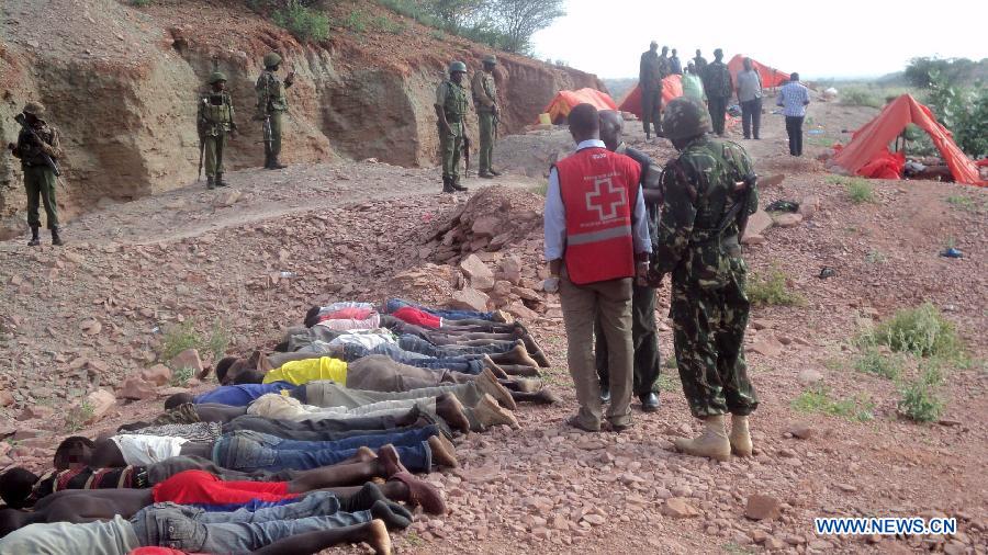 Bodies of victims are seen at a quarry at Koromey area in the outskirts of Mandera town, Kenya, Dec. 2, 2014. Kenyan presidential spokesman Manoah Esipisu said Tuesday heavily armed bandits raided a quarry workers' camp at Koromey at around 2 a.m., killing 36 people. (Xinhua/Fabian Mangera) |