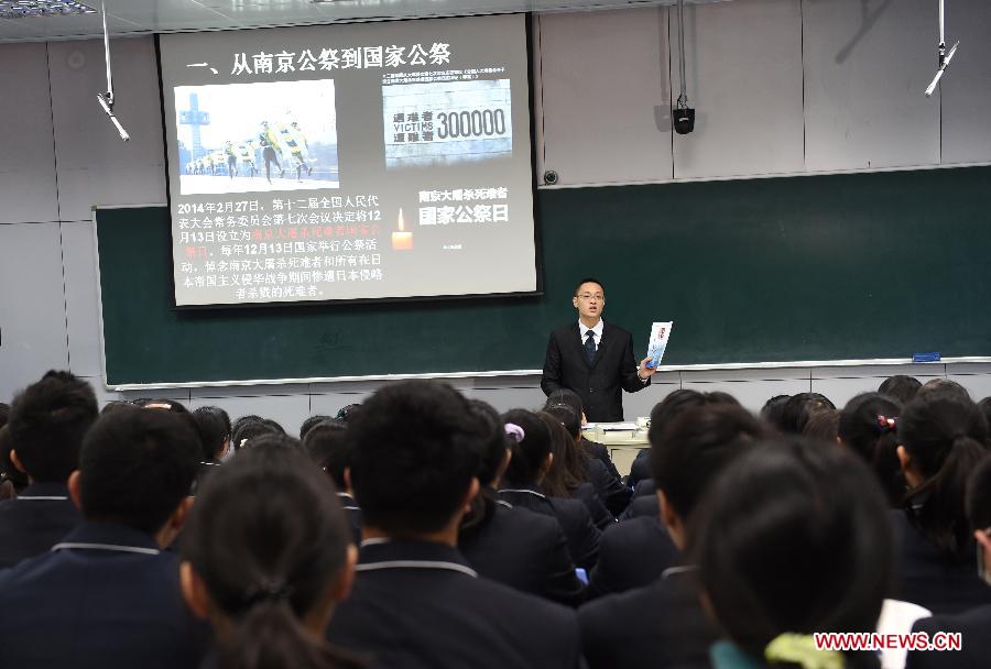 History instructor Fan Shiwen teaches in a course opened in Nanjing No. 1 Middle School in Nanjing, capital of east China's Jiangsu Province, Dec. 2, 2014. Nanjing opened courses Tuesday for students based on the textbooks "Warning and Thinking", "Memory of Blood and Fire" and "Historical Truth" issued on Monday. In February of this year, China's top legislature designated Dec. 13 as the National Memorial Day to mourn the Nanjing Massacre victims and all of those killed by Japanese invaders. (Xinhua/Sun Can) |