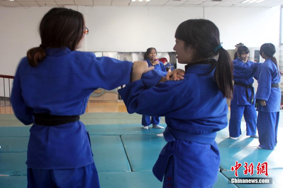College girls in Zhengzhou University take women's self-defense training. (CNS/Ma Yiheng)