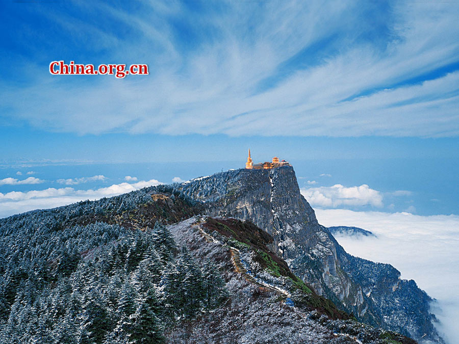 The Golden Summit is one of four scenic areas at Mt. Emei, a towering, beautiful mountain in central Sichuan province. The Golden Summit, the mountain's main peak at 3,079.3 meters above sea level, seems to almost touch the sky. There are four classic scenes at the Golden Summit: the sea of clouds, the sunrise, the "Buddha rays", and the "saint lamps." [China.org.cn by Zuo Jiang] |