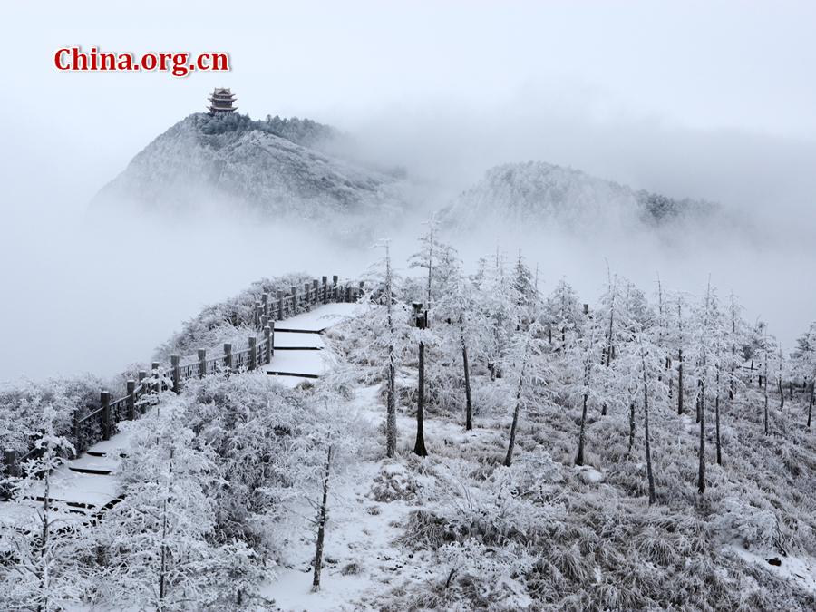 The Golden Summit is one of four scenic areas at Mt. Emei, a towering, beautiful mountain in central Sichuan province. The Golden Summit, the mountain's main peak at 3,079.3 meters above sea level, seems to almost touch the sky. There are four classic scenes at the Golden Summit: the sea of clouds, the sunrise, the "Buddha rays", and the "saint lamps." [China.org.cn by Zuo Jiang]