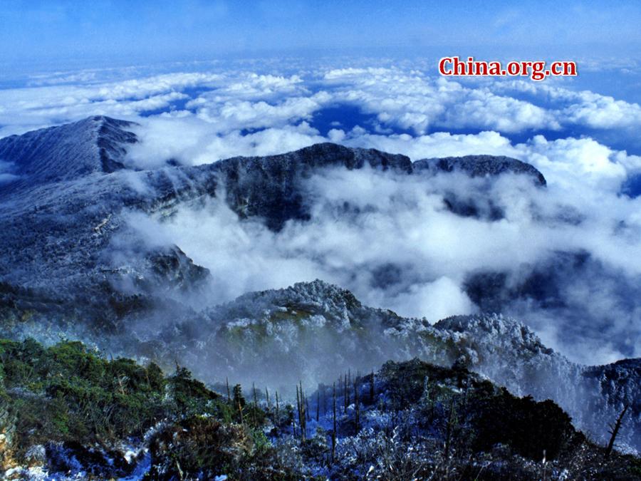 The Golden Summit is one of four scenic areas at Mt. Emei, a towering, beautiful mountain in central Sichuan province. The Golden Summit, the mountain's main peak at 3,079.3 meters above sea level, seems to almost touch the sky. There are four classic scenes at the Golden Summit: the sea of clouds, the sunrise, the "Buddha rays", and the "saint lamps." [China.org.cn by Zuo Jiang]