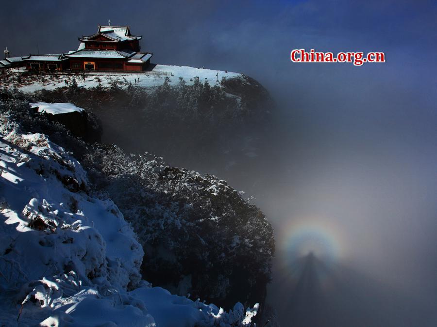 The Golden Summit is one of four scenic areas at Mt. Emei, a towering, beautiful mountain in central Sichuan province. The Golden Summit, the mountain's main peak at 3,079.3 meters above sea level, seems to almost touch the sky. There are four classic scenes at the Golden Summit: the sea of clouds, the sunrise, the "Buddha rays", and the "saint lamps." [China.org.cn by Zuo Jiang] |