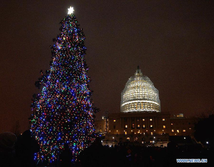 The Capitol Christmas Tree is lit in front of the Capitol Hill in Washington D.C., capital of the United States, Dec. 2, 2014. The 2014 Capitol Christmas Tree is a white spruce from the Chippewa National Forest in Cass Lake, Minnesota. (Xinhua/Bao Dandan) |