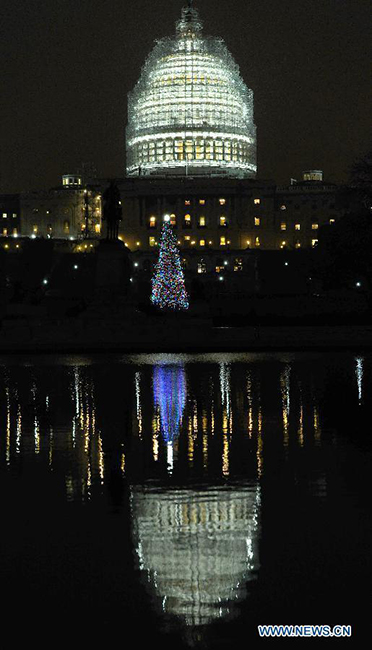 The Capitol Christmas Tree is lit in front of the Capitol Hill in Washington D.C., capital of the United States, Dec. 2, 2014. The 2014 Capitol Christmas Tree is a white spruce from the Chippewa National Forest in Cass Lake, Minnesota. (Xinhua/Bao Dandan) |