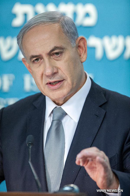 Israeli Prime Minister Benjamin Netanyahu speaks during a press conference at his office in Jerusalem, Dec. 2, 2014. Israeli Prime Minister Benjamin Netanyahu announced his support for dispersing the Knesset (parliament) and conducting early elections amid a coalition crisis. Netanyahu also said he has ordered to fire Justice Minister Tzipi Livni and Finance Minister Yair Lapid, who he said plotted against him by outspokenly criticizing his policies. (Xinhua/JINI) |