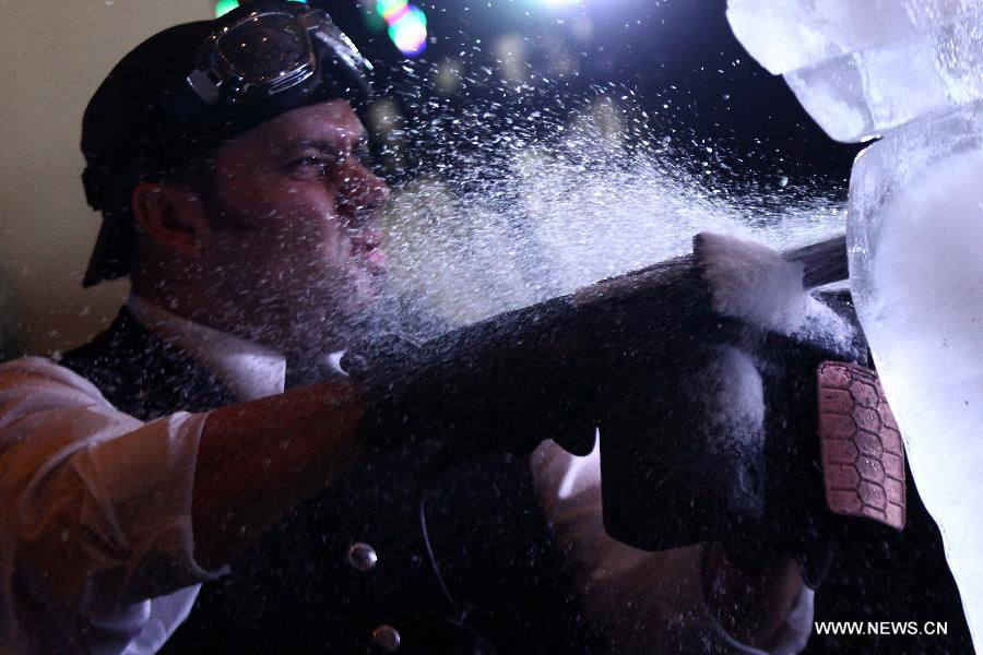 Max Zuleta of Ice Beat Factory uses a chainsaw to create an ice sculpture at a mall in Quezon City, the Philippines, Dec. 3, 2014. Ice Beat Factory mixes music and sculpting in its performances. (Xinhua/Rouelle Umali)