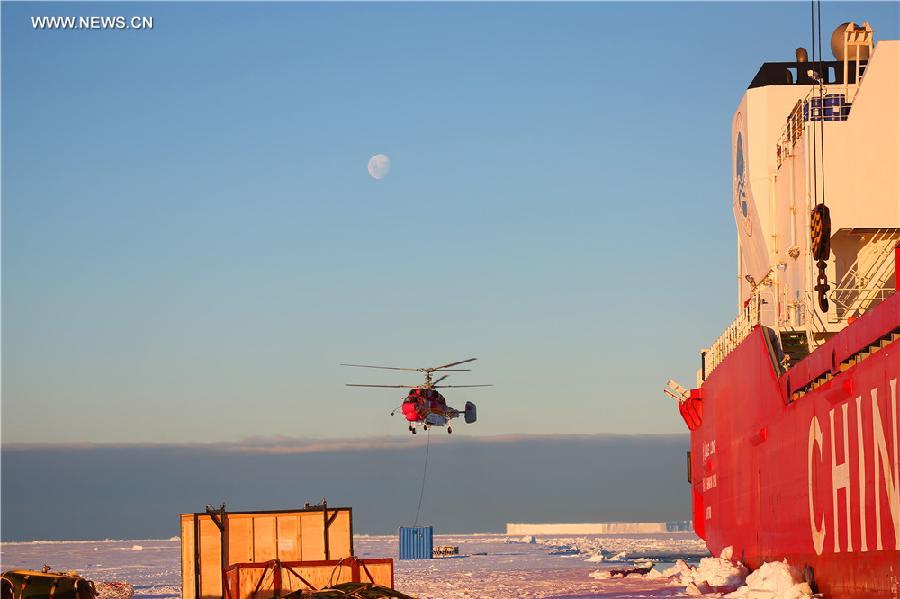 Photo taken on Dec. 3, 2014 shows a helicopter hauling a box near the Chinese Icebreaker Xuelong, or Snow Dragon, which carries a Chinese scientific expedition team. The team is preparing to head for the Antarctic Zhongshan Station, a Chinese scientific research base in Antarctica. (Xinhua/Bai Yang) |