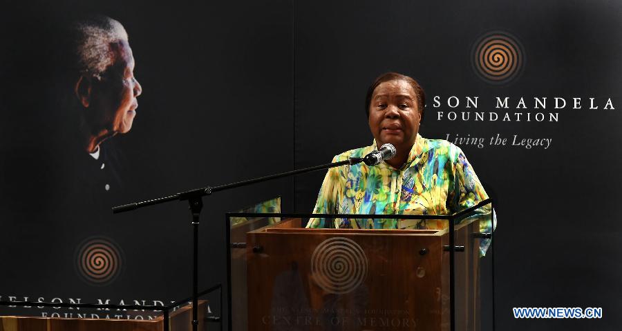 South Africa's Science and Technology Minister Naledi Pandor speaks at the opening ceremony of the Nelson Mandela Condolence Books Exhibition at the Nelson Mandela Centre of Memory of Johannesburg, South Africa, on Dec. 4, 2014. The Nelson Mandela Condolence Books Exhibition was held Thursday to mark the upcoming first anniversary of the late South Africa's President Nelson Mandela's passing which falls on Dec. 5, 2014. A total of 4850 condolence books which were brought by South Africa's embassies all over the world and more than 100 domestic condolence books are scheduled displayed during the exhibition. (Xinhua/DOC/Kopano Tlape) |