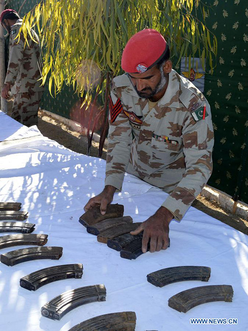 A Pakistani paramilitary Frontier Corps officer displays weapons seized during an operation in southwest Pakistan's Quetta, Dec. 4, 2014. Frontier Corps recovered huge quantities of explosive materials, detonators, arms and ammunition during an operation in Qila Abdullah and Mastung area near Quetta on Thursday, local media reported. (Xinhua/Irfan)