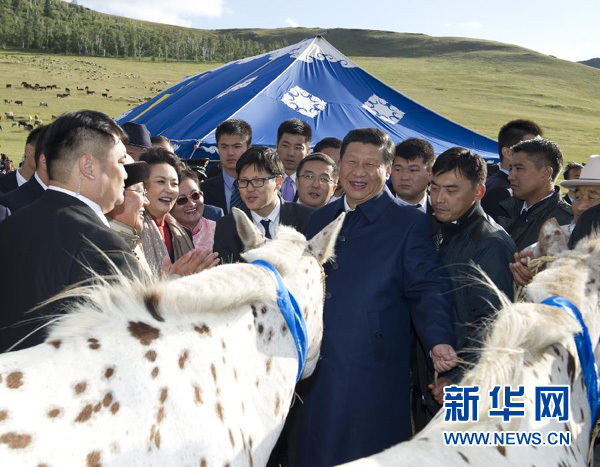 The two Mongolian horses, given to the Chinese president and his wife as gifts of goodwill, were named after Altay Mountains and Kherlen River respectively, an indication of China-Mongolia neighborliness blessed by border mountains and rivers. |