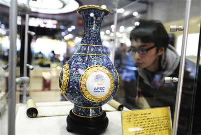 Chinese President Xi Jinping and his wife Peng Liyuan gave leaders of the 21 APEC member economies cloisonne vases as gifts of goodwill while their spouses gold clutch bags, gold brooches, silk handkerchiefs and silver fruit trays.