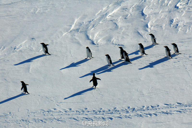 China's 31st Antarctic expedition unloads goods near the Antarctic ice sheet as a crowd of penguins gather around it. On Dec.4, 2014, Chinese research vessel and icebreaker Xuelong (Snow Dragon) set off from Shanghai on the country's 31st Antarctic expedition. It is scheduled to return in next April. (Photo/CCTV News official microblog)