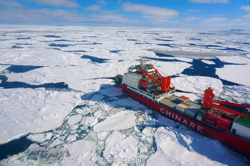 China's 31st Antarctic expedition unloads goods near the Antarctic ice sheet as a crowd of penguins gather around it. On Dec.4, 2014, Chinese research vessel and icebreaker Xuelong (Snow Dragon) set off from Shanghai on the country's 31st Antarctic expedition. It is scheduled to return in next April. (Photo/CCTV News official microblog) |