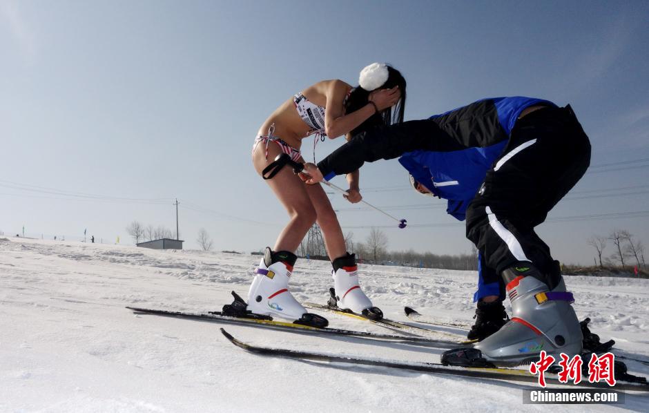 Ski models in bikinis. (Chinanews/Hu Youjun)