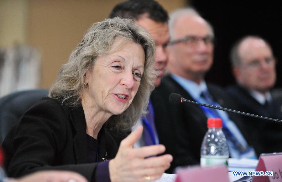 Jo Ivey Boufford, representative of InterAcademy Medical Panel, speaks at the Urban Health and Wellbeing - International Programme Meeting in Xiamen, southeast China's Fujian Province, Dec. 9, 2014. About 60 experts attended the meeting of Urban Health and Wellbeing International Programme held by International Council for Science (ICSU), InterAcademy Medical Panel and United Nations University at the Institute of Urban Environment of Chinese Academy of Science on Tuesday. (Xinhua/Lin Shanchuan) |