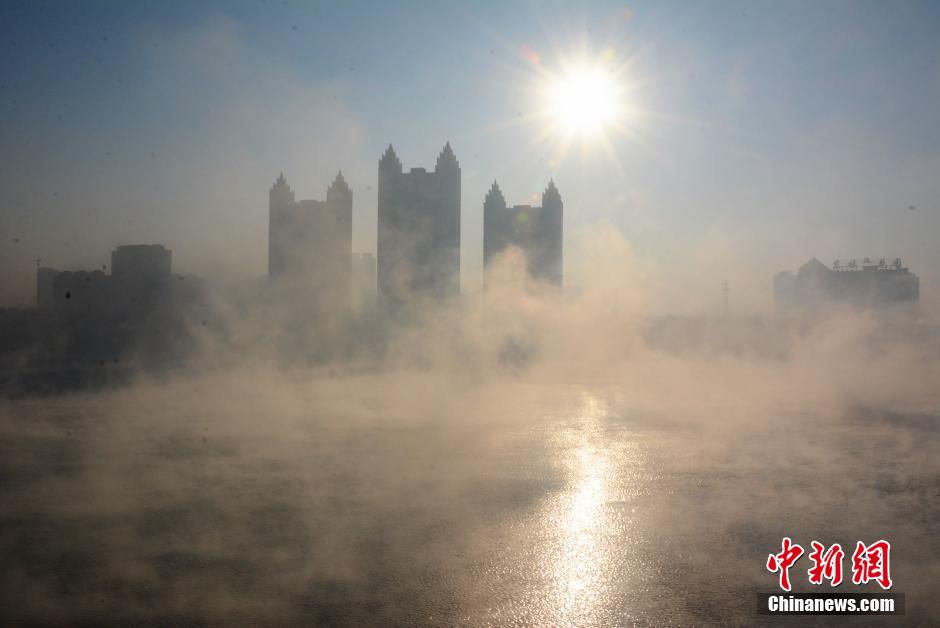 Dense fog shrouds the Songhua River in Jilin city, northeast China's Jilin province on Dec. 8, 2014. Linjiangmen Bridge and buildings on the banks of the river shrouded in fog loom up like a mirage. (CNS/Wang Mingming)