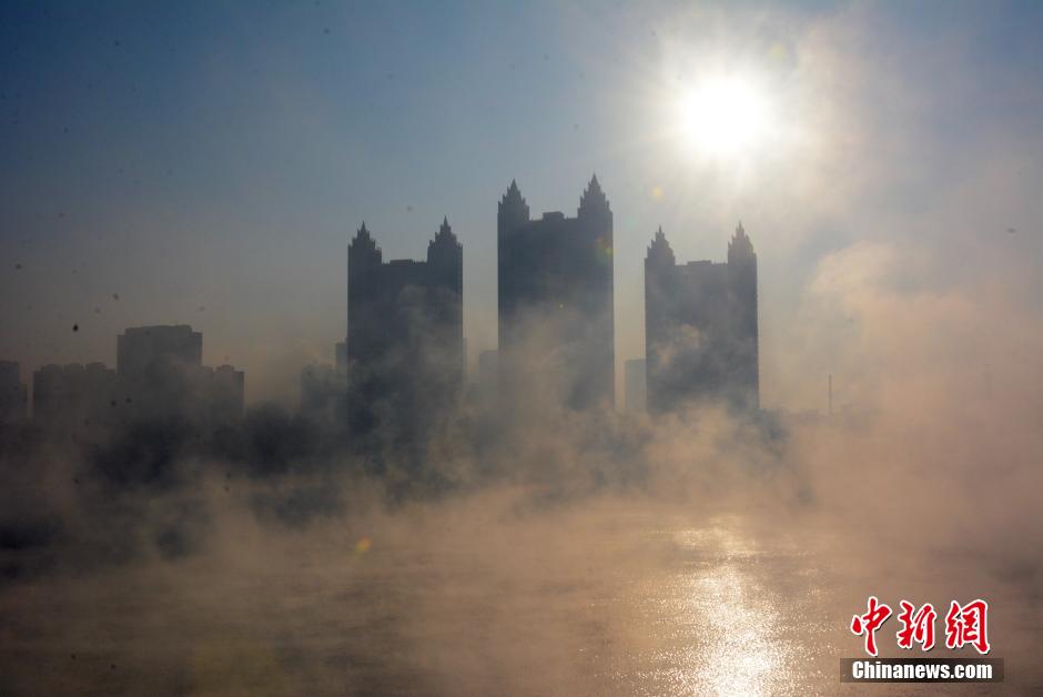 Dense fog shrouds the Songhua River in Jilin city, northeast China's Jilin province on Dec. 8, 2014. Linjiangmen Bridge and buildings on the banks of the river shrouded in fog loom up like a mirage. (CNS/Wang Mingming)