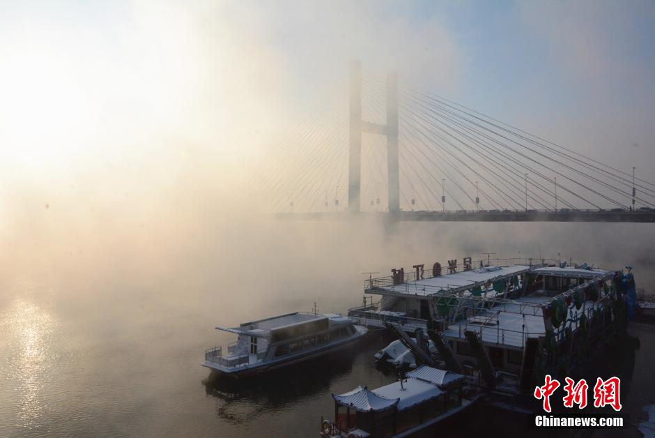 Dense fog shrouds the Songhua River in Jilin city, northeast China's Jilin province on Dec. 8, 2014. Linjiangmen Bridge and buildings on the banks of the river shrouded in fog loom up like a mirage. (CNS/Wang Mingming)