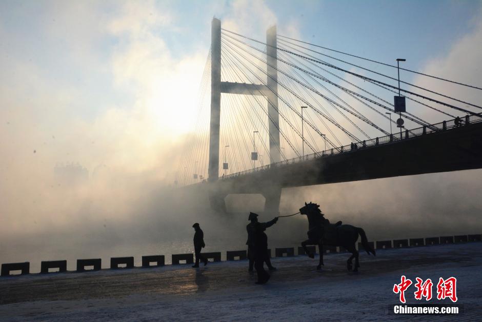 Dense fog shrouds the Songhua River in Jilin city, northeast China's Jilin province on Dec. 8, 2014. Linjiangmen Bridge and buildings on the banks of the river shrouded in fog loom up like a mirage. (CNS/Wang Mingming)