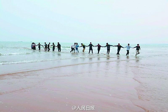On Dec. 7, 2014, a woman in yellow walked alone into the sea, and was soon submerged in Qinhuangdao, north China’s Hebei province. Eighteen students of Yanshan University bravely burst into the icy sea water to rescue her. They stood hand in hand against the cold wind, forming a flesh chain of three to four meters long. Finally, the woman was rescued.