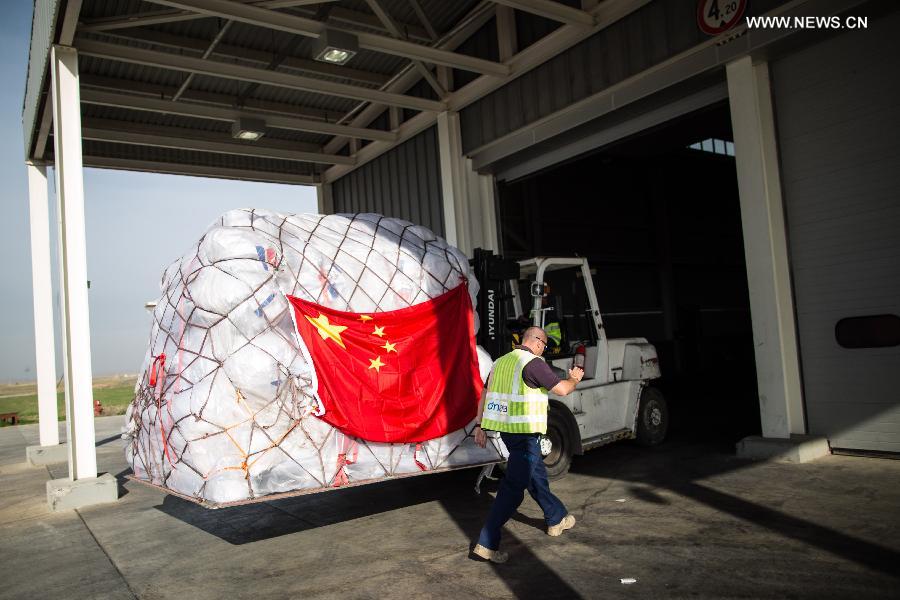 China's humanitarian aid items are seen in Erbil International Airport in the Iraqi Kurdish regional capital of Erbil, Dec. 9, 2014. Two aircraft carrying the China's humanitarian aid items arrived in Erbil, the capital city of Iraqi Kurdish region on Tuesday. (Xinhua/Chen Xu) |