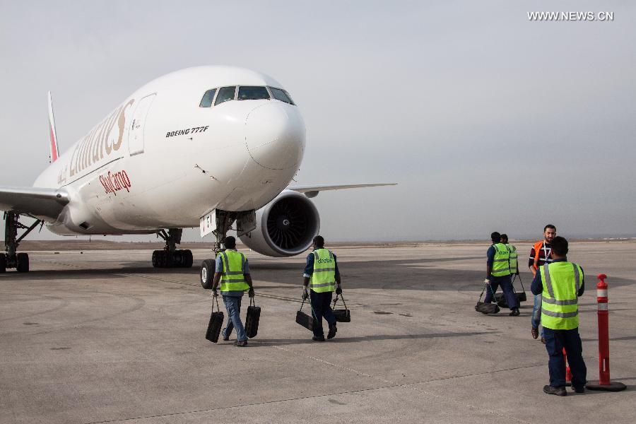 A cargo plane carrying China's humanitarian aid items arrives in Erbil International Airport in the Iraqi Kurdish regional capital of Erbil, Dec. 9, 2014. Two aircraft carrying the China's humanitarian aid items arrived in Erbil, the capital city of Iraqi Kurdish region on Tuesday. (Xinhua/Chen Xu)