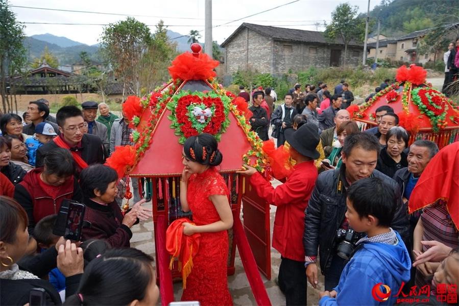 Six pairs of bride and grooms from Shanghai hold a traditional wedding ceremony with local characteristics. (Photo/People.cn)
