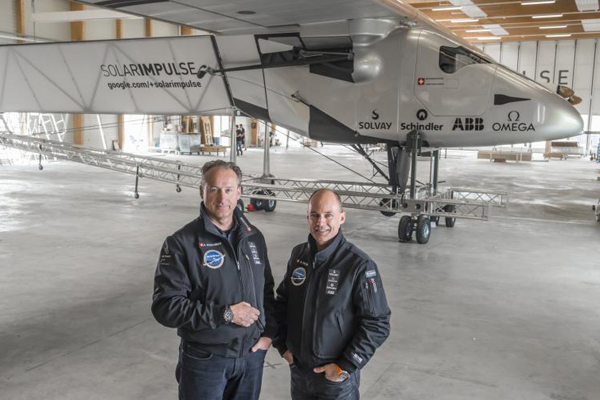 André Borschberg and Bertrand Piccard in front of Solar Impulse. (Photo provided by Solar Impulse team) |