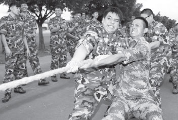 Students and soldiers compete in a tug-of-war competition during a 2013 summer camp organized by the PLA garrison. Provided to China Daily |