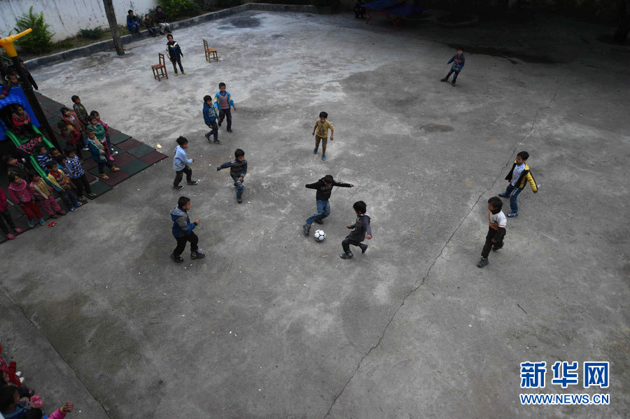 Students play football on the playground in a village in Dahua Yao Autonomous County in south China's Guangxi on Dec. 8, 2014. (Xinhua News Agency/Zhang Ailin)
