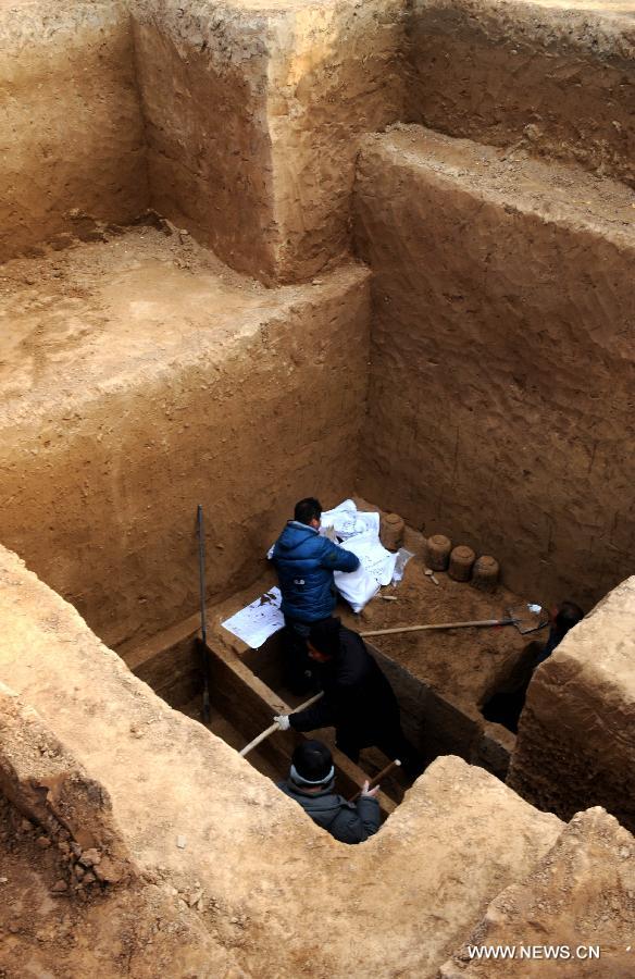 Archaeologists work in graves at the excavating spot of ancient relics of the Han Dynasty (202 BC-220 AD), in Wenxian County, central China's Henan Province, Dec. 11, 2014. (Xinhua/Zhu Xiang)
