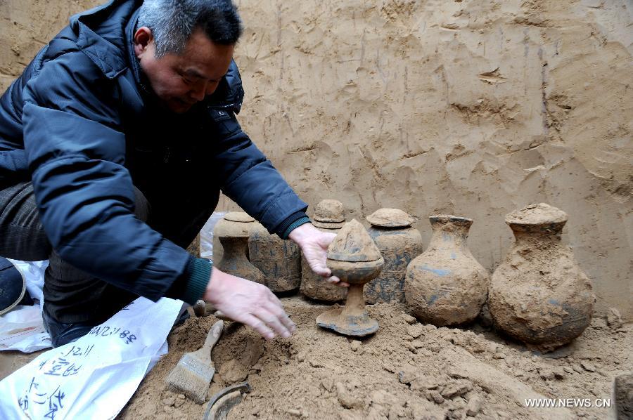 An archaeologist works in a grave at the excavating spot of ancient relics of the Han Dynasty (202 BC-220 AD), in Wenxian County, central China's Henan Province, Dec. 11, 2014. (Xinhua/Zhu Xiang)