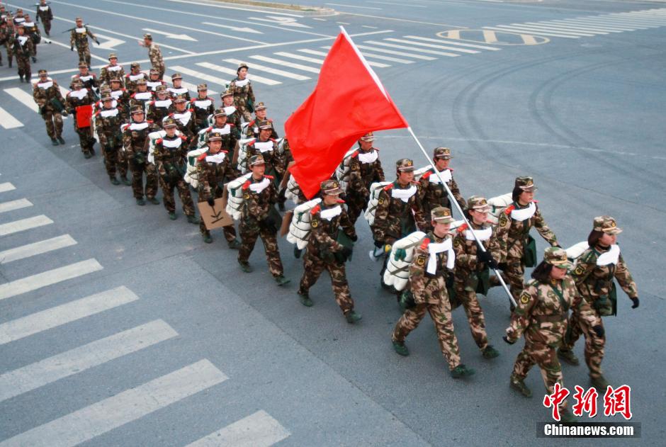 More than 3,000 new female recruits of Beijing Armed Police Force receive training in suburb of Beijing on Dec. 9, 2014. Training subjects include forced march, camping and military boxing in order to strengthen physical condition of the new recruits. (CNS/Yang Huifeng)