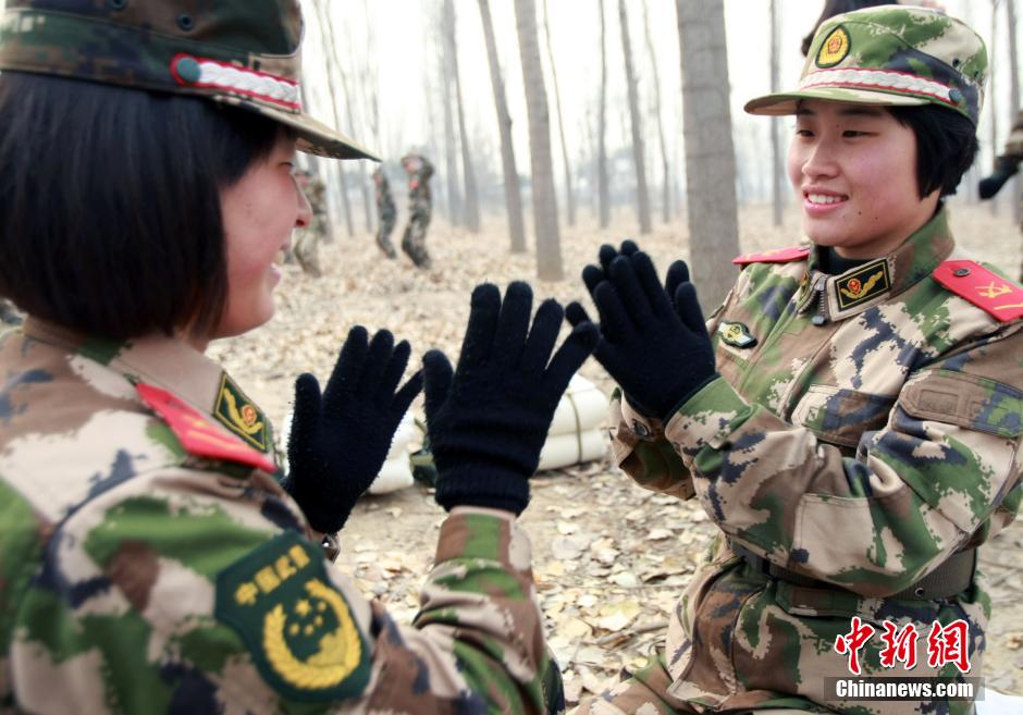More than 3,000 new female recruits of Beijing Armed Police Force receive training in suburb of Beijing on Dec. 9, 2014. Training subjects include forced march, camping and military boxing in order to strengthen physical condition of the new recruits. (CNS/Yang Huifeng)