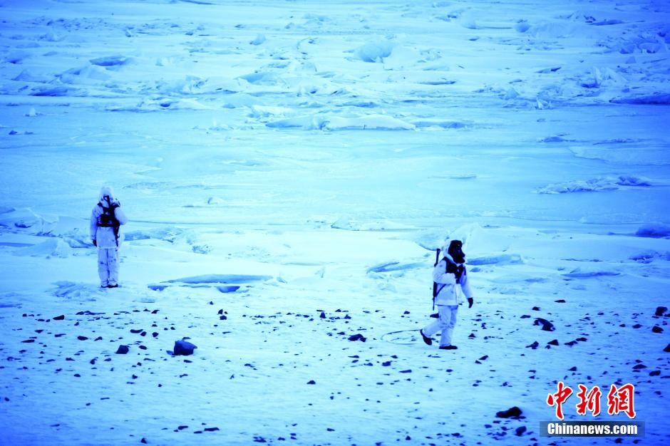 Xin Guoqiang and Zhang Bo, two sentries of the “Good Eighth Company in Heihe”, patrol at the China-Russia boundary river in severe cold of minus 32 degrees Celsius on Dec. 10, 2014. (Chinanews/Wei Jianshun)