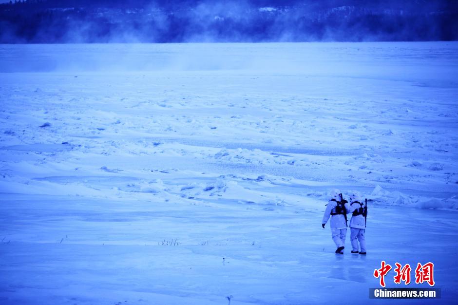 Xin Guoqiang and Zhang Bo, two sentries of the “Good Eighth Company in Heihe”, patrol at the China-Russia boundary river in severe cold of minus 32 degrees Celsius on Dec. 10, 2014. (Chinanews/Wei Jianshun)