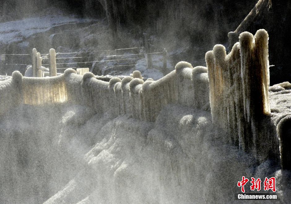 Silver thaw is formed along both sides of the Hukou waterfall of Huanghe River, north China's Shanxi province as temperature drops on Dec. 11, 2014. The spectacular scene of icefall and ice pillars attracted many tourists. (Chinanews/Rao Beicheng)