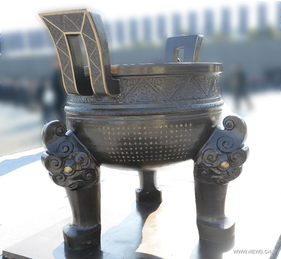 Photo taken on Dec. 13, 2014 shows the memorial "ding," a type of ancient Chinese cauldron symbolizing state power and prosperity, for the Nanjing Massacre victims at the state ceremony for China's first National Memorial Day for Nanjing Massacre Victims at the memorial hall for the massacre victims in Nanjing, east China's Jiangsu Province. Chinese President Xi Jinping, along with Xia Shuqin, an 85-year-old massacre survivor, and a school child, unveiled the "ding". (Xinhua/Ma Zhancheng) |