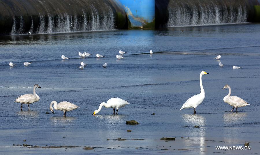 Whooper swans look for food on the Liangchenghekou Wetland in Rizhao, east China's Shandong Province, Dec. 13, 2014. More than 50 species of birds came to the Liangchenghekou Wetland to spend winter this year thanks to the local authority's efforts to improve the ecological environment on the wetland in the past years. (Xinhua/Fan Changguo)