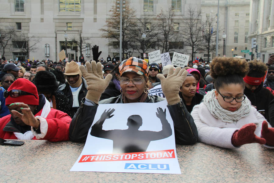 Mellisa Morton, from Quincy of New York, prayed for better future during the "Justice for All" civil rights march in Washington DC, Dec. 13, 2014. (People's Daily Online/Liao Zhengjun)
