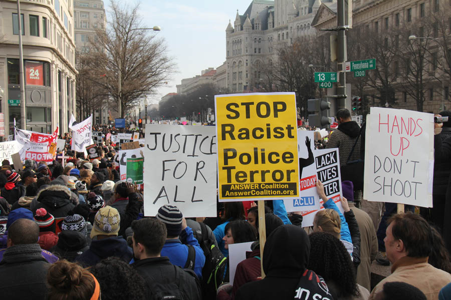 Thousands of protesters marched from Freedom Plaza to U.S. Capitol in the "Justice for All" civil rights march, calling for an end to racism, and police violence in Washington DC, Dec. 13, 2014. (People's Daily Online/Liao Zhengjun)