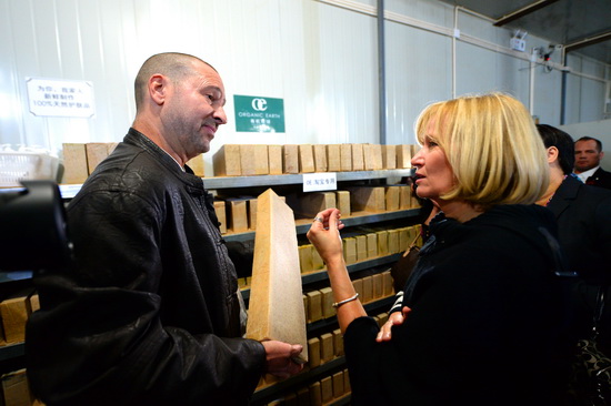 Laureen Harper tries "Cocoa Kiss", a skin care soap in the factory and praises its pure taste. (Photo/ Huang Ying)