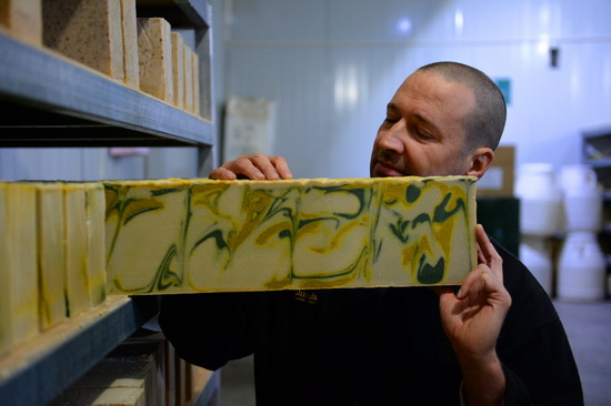Darren Moore checks the unique color patterns formed in the handmade soap. (Photo/ Huang Ying)